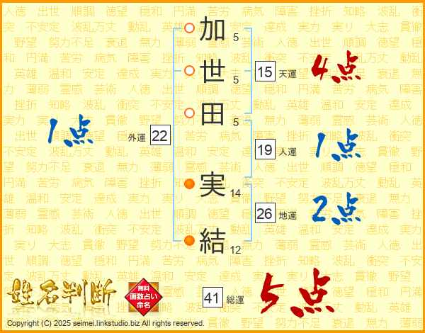 加(5画)世(5画)田(5画) 実(14画)結(12画)