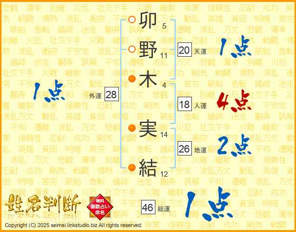 卯(5画)野(11画)木(4画) 実(14画)結(12画)