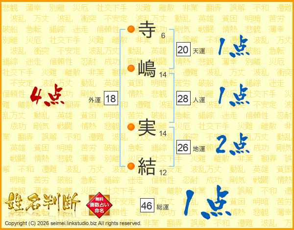寺(6画)嶋(14画) 実(14画)結(12画)
