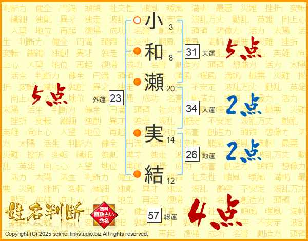 小(3画)和(8画)瀬(20画) 実(14画)結(12画)