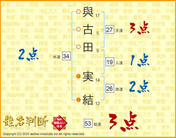 與(17画)古(5画)田(5画) 実(14画)結(12画)