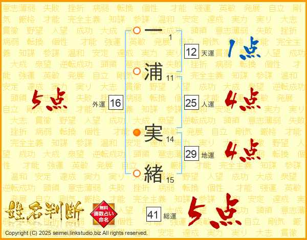 あなたの人生を表す1番重要な運勢です。生涯を通じて影響する総合運となり、主に50歳以降の晩年期に影響を及ぼします。苗字と名前の合計画数。