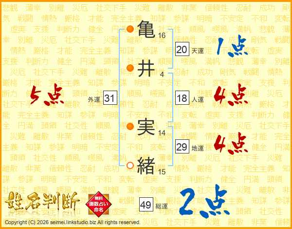 亀(16画)井(4画) 実(14画)緒(15画)