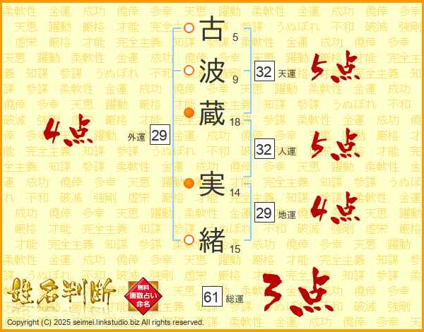 古(5画)波(9画)蔵(18画) 実(14画)緒(15画)