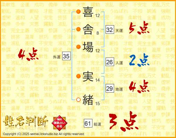 喜(12画)舎(8画)場(12画) 実(14画)緒(15画)