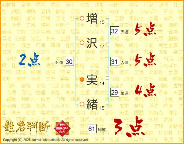 生活面を象徴する運勢です。外部から受ける影響力を表し、結婚運、家庭運や職場、環境への順応性を表します。総運から人運を引いた画数。姓や名が1文字の場合を除く。
