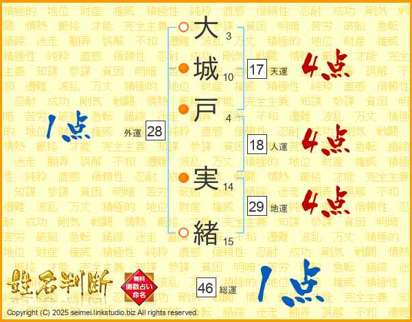 大(3画)城(10画)戸(4画) 実(14画)緒(15画)