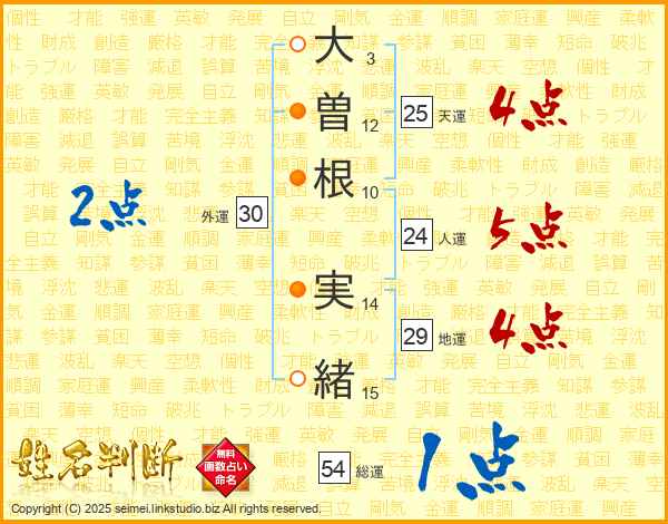 大(3画)曽(12画)根(10画) 実(14画)緒(15画)