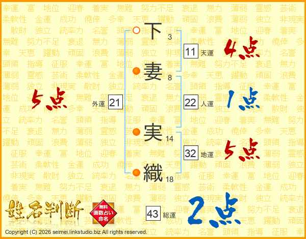 生活面を象徴する運勢です。外部から受ける影響力を表し、結婚運、家庭運や職場、環境への順応性を表します。総運から人運を引いた画数。姓や名が1文字の場合を除く。