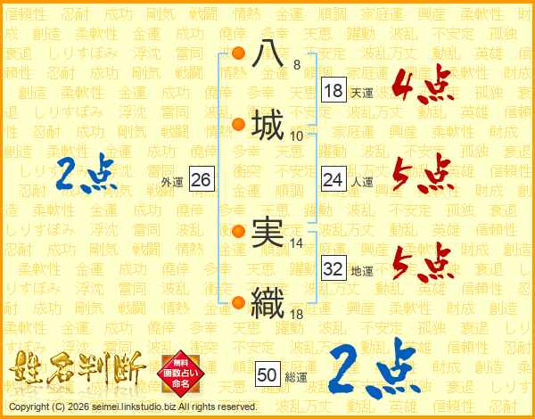 生活面を象徴する運勢です。外部から受ける影響力を表し、結婚運、家庭運や職場、環境への順応性を表します。総運から人運を引いた画数。姓や名が1文字の場合を除く。