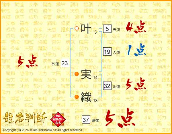 生活面を象徴する運勢です。外部から受ける影響力を表し、結婚運、家庭運や職場、環境への順応性を表します。総運から人運を引いた画数。姓や名が1文字の場合を除く。