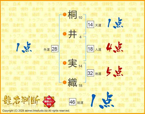 桐(10画)井(4画) 実(14画)織(18画)