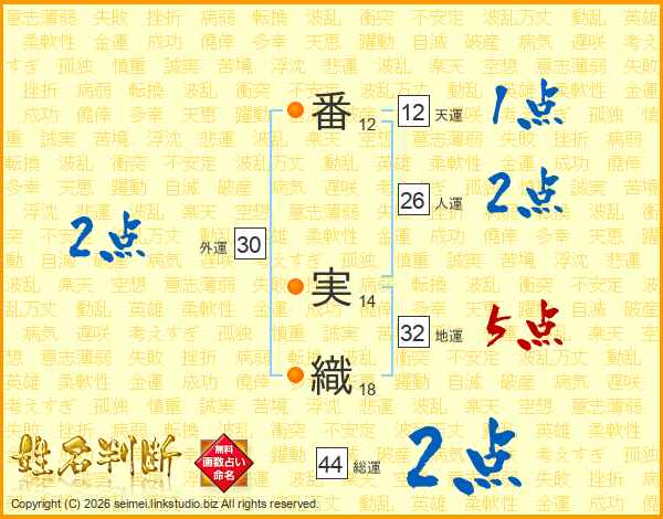 あなたの人生を表す1番重要な運勢です。生涯を通じて影響する総合運となり、主に50歳以降の晩年期に影響を及ぼします。苗字と名前の合計画数。