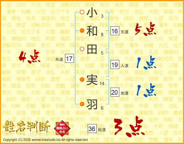 小(3画)和(8画)田(5画) 実(14画)羽(6画)