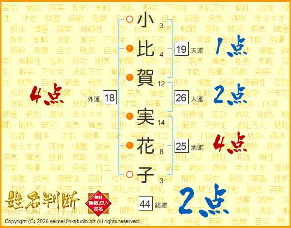 小(3画)比(4画)賀(12画) 実(14画)花(8画)子(3画)