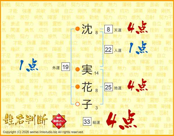 沈実花子さんの総運は33画の4点!