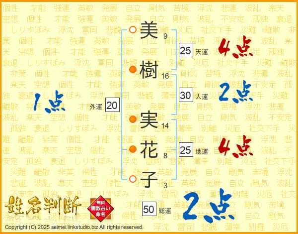 美(9画)樹(16画) 実(14画)花(8画)子(3画)