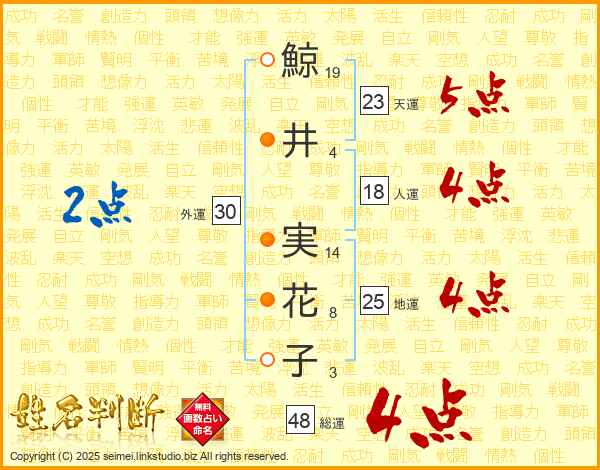 鯨(19画)井(4画) 実(14画)花(8画)子(3画)