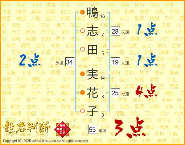 鴨(16画)志(7画)田(5画) 実(14画)花(8画)子(3画)