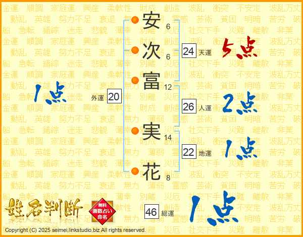 安(6画)次(6画)富(12画) 実(14画)花(8画)