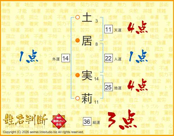 土(3画)居(8画) 実(14画)莉(11画)