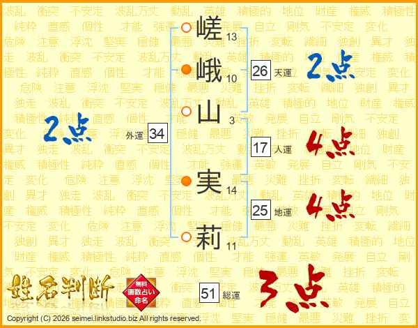 嵯(13画)峨(10画)山(3画) 実(14画)莉(11画)