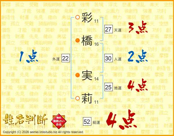彩(11画)橋(16画) 実(14画)莉(11画)
