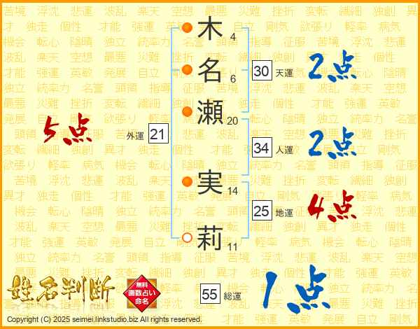 木(4画)名(6画)瀬(20画) 実(14画)莉(11画)