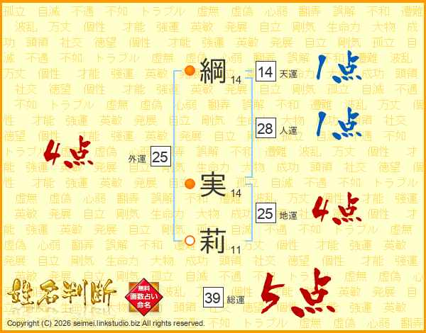 綱(14画) 実(14画)莉(11画)
