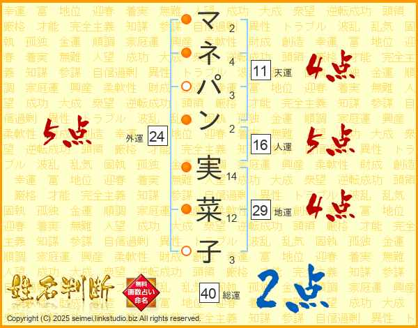 マ(2画)ネ(4画)パ(3画)ン(2画) 実(14画)菜(12画)子(3画)