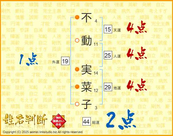 不(4画)動(11画) 実(14画)菜(12画)子(3画)