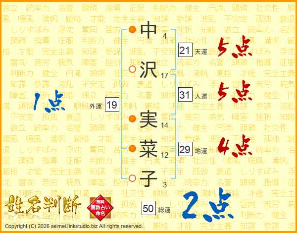 中(4画)沢(17画) 実(14画)菜(12画)子(3画)