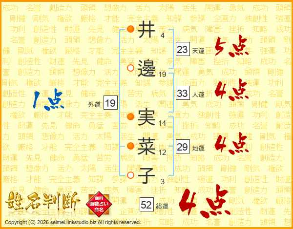 井(4画)邊(19画) 実(14画)菜(12画)子(3画)
