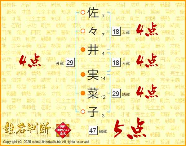 佐(7画)々(7画)井(4画) 実(14画)菜(12画)子(3画)