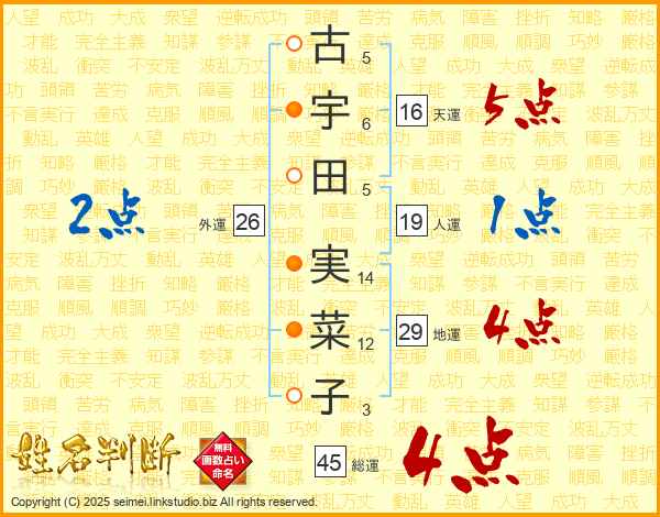 古(5画)宇(6画)田(5画) 実(14画)菜(12画)子(3画)