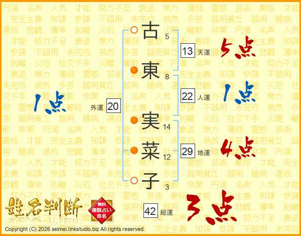 古(5画)東(8画) 実(14画)菜(12画)子(3画)