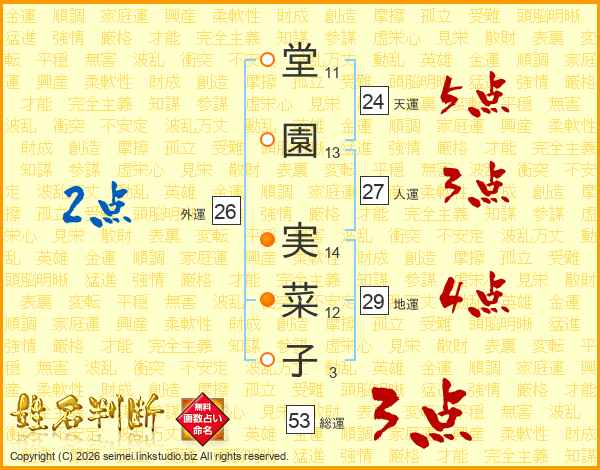 堂(11画)園(13画) 実(14画)菜(12画)子(3画)