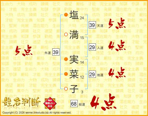 塩(24画)満(15画) 実(14画)菜(12画)子(3画)