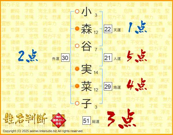 小(3画)森(12画)谷(7画) 実(14画)菜(12画)子(3画)