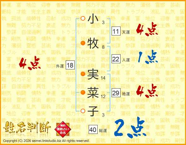 小(3画)牧(8画) 実(14画)菜(12画)子(3画)
