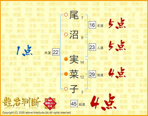 尾(7画)沼(9画) 実(14画)菜(12画)子(3画)