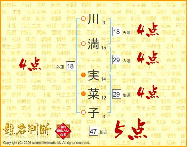川(3画)満(15画) 実(14画)菜(12画)子(3画)