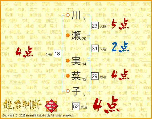 川(3画)瀬(20画) 実(14画)菜(12画)子(3画)