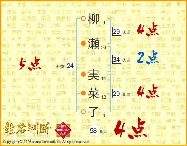 柳(9画)瀬(20画) 実(14画)菜(12画)子(3画)