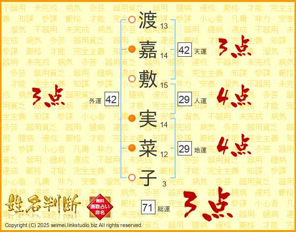 渡(13画)嘉(14画)敷(15画) 実(14画)菜(12画)子(3画)