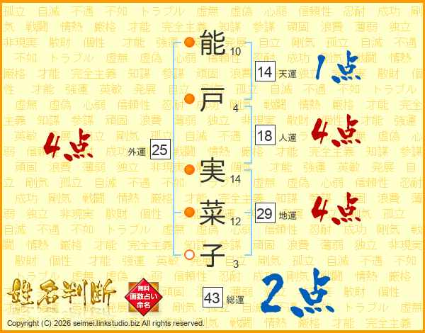 能(10画)戸(4画) 実(14画)菜(12画)子(3画)