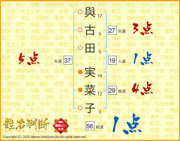 與(17画)古(5画)田(5画) 実(14画)菜(12画)子(3画)