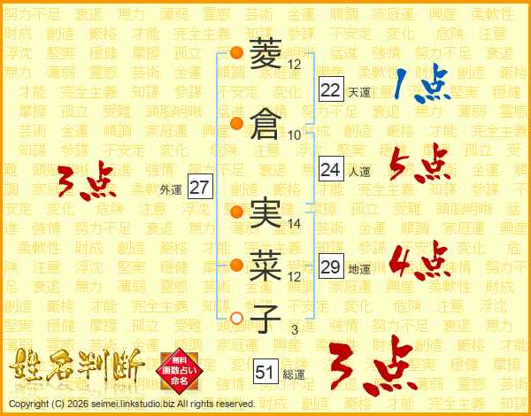 菱(12画)倉(10画) 実(14画)菜(12画)子(3画)