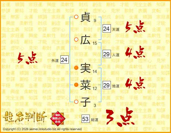 貞(9画)広(15画) 実(14画)菜(12画)子(3画)