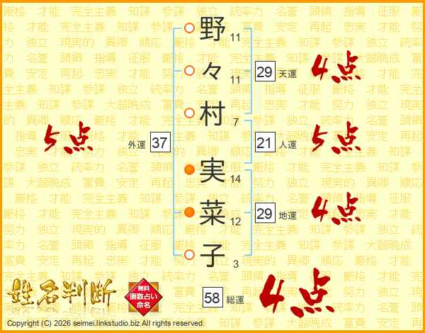 野々村実菜子さんの総運は58画の4点!